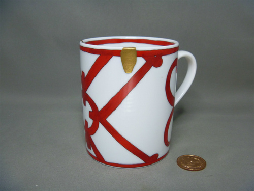先般ご依頼を戴きました エルメスのマグカップです。白い生地に、燃えるような赤でのデザインが特徴的です。日本の『金襴手』や『錦手』に代表されるように「白」と「赤」(朱)と「金」は、大変良く調和します。依頼品は、欠けとヒビ部分を 純金丸粉24K で金継ぎさせて戴きました。純金部分が、赤に映えると共に、新たな景色となり美しく仕上がりました。