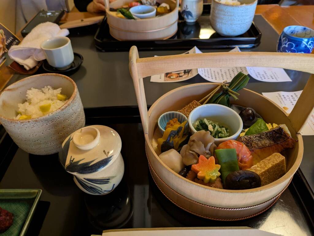 「手をけ弁当」と土瓶蒸しをごちそうになりました。手桶の中にぎっしりとお料理が盛り付けてあります。