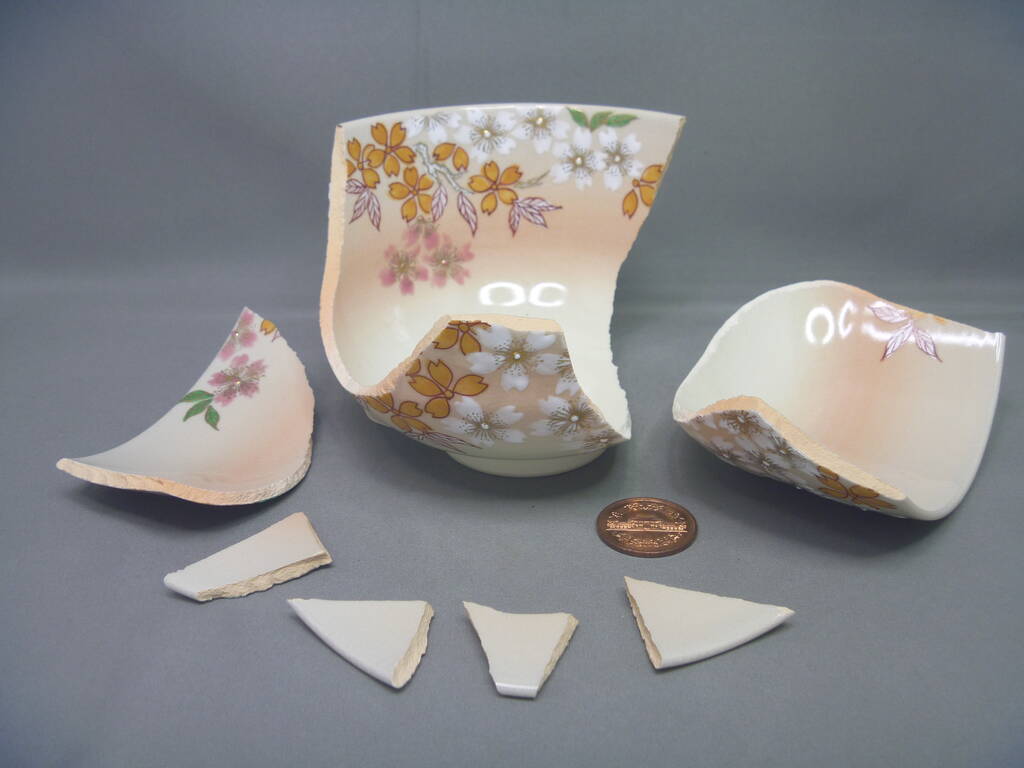 御本手のあたたかい色調の生地に遠近感・立体感のある桜の上絵が美しいお茶碗です。ご依頼いただきました折は、大小7つの破片に割れた状態でした。